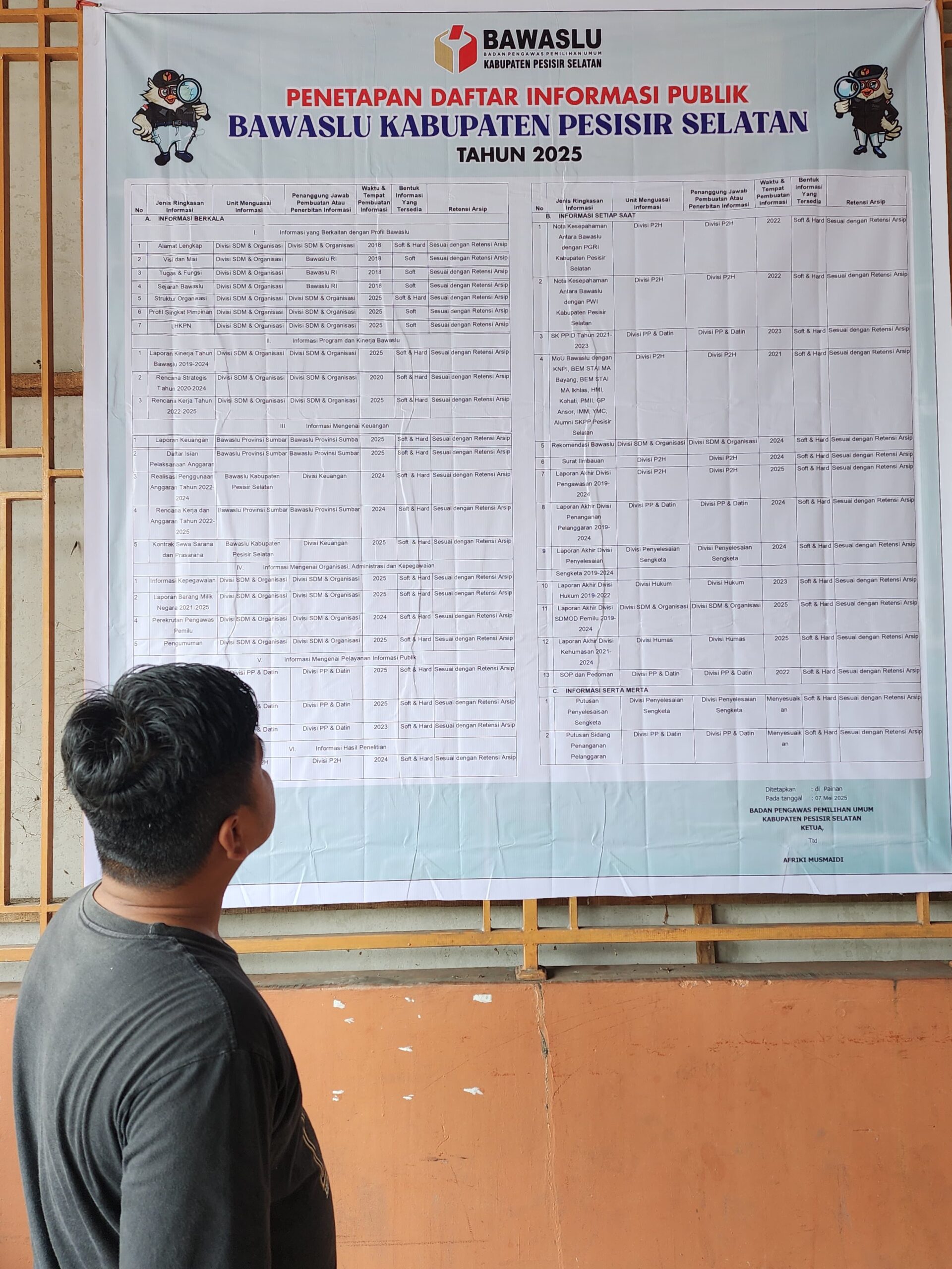 KITASIAR.com – Badan Pengawas Pemilihan Umum (Bawaslu) Kabupaten Pesisir Selatan (Pessel) terus menunjukkan komitmennya dalam mengimplementasikan keterbukaan informasi publik sebagai bagian dari upaya mewujudkan pengawasan pemilu yang transparan dan akuntabel. Hal tersebut dilakukan Bawaslu Pesisir Selatan, dengan secara aktif menyusun dan mempublikasikan Daftar Informasi Publik (DIP) kepada masyarakat.