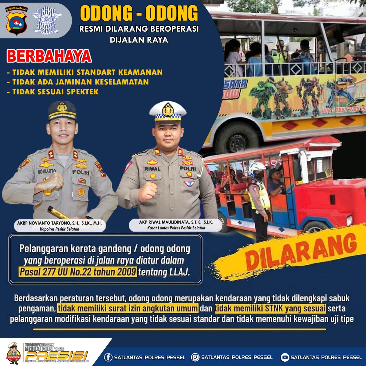 “Sebelum melakukan tindakan preventif berupa tilang, kita akan sosialisasikan (persuasif) dalam beberapa minggu kedepan. Kita akan undang pemilik odong-odang. Tentang larangan beroperasi odong-odong,” tegas Kasat Lantas Polres Pessel.
