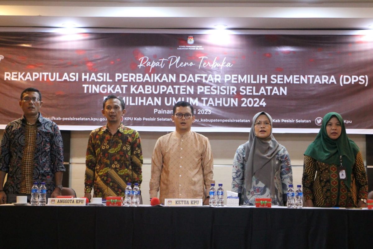 Perihal ini diumumkan dalam Rapat Pleno Terbuka Rekapitulasi Hasil Perbaikan Daftar Pemilih Sementara (DPS) tingkat Kabupaten Pesisir Selatan Pemilihan Umum Tahun 2024 di Painan, Jumat (12/5/2023).