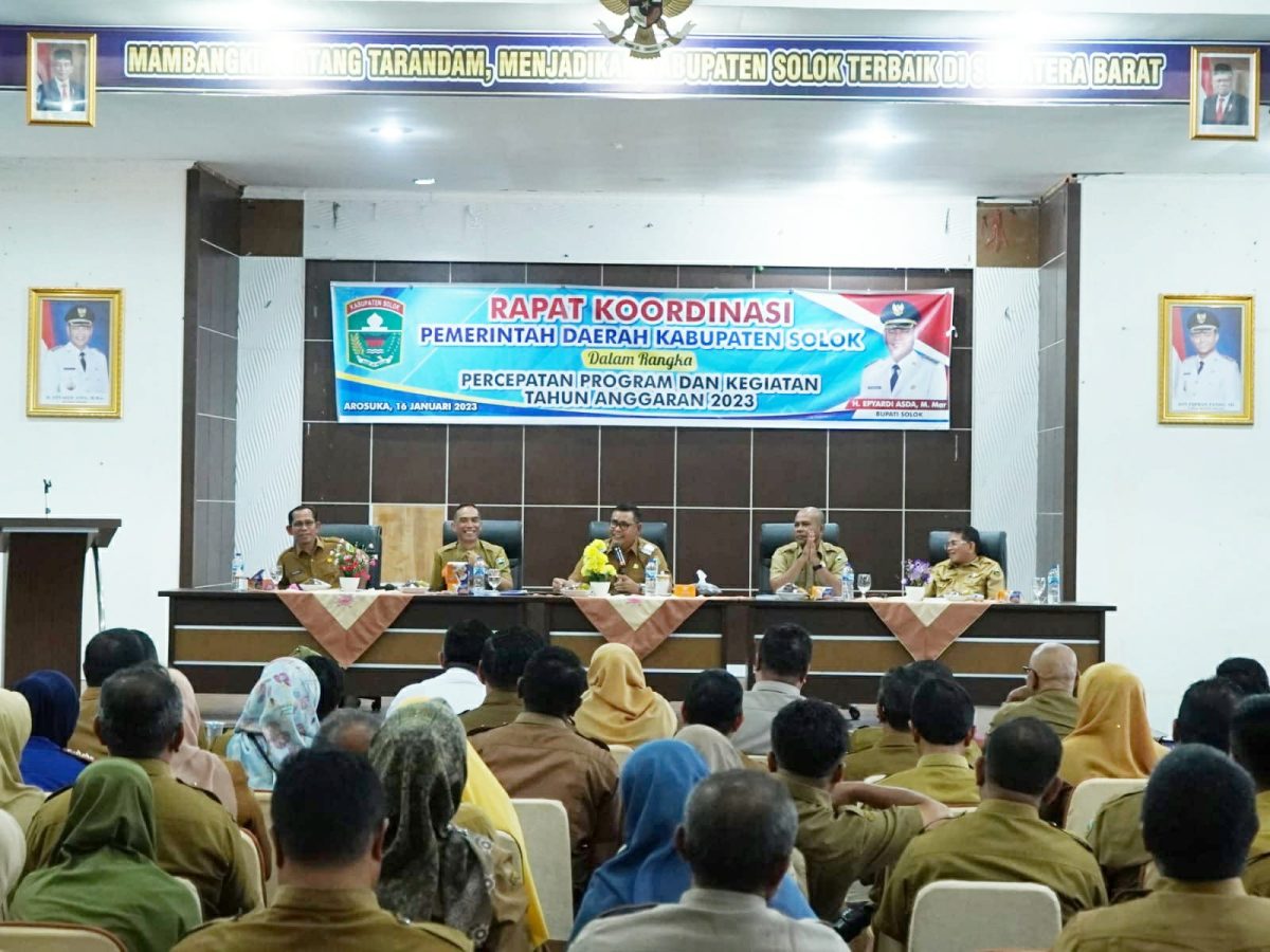 KITASIAR.com – Untuk membahas percepatan program dan kegiatan Tahun Anggaran 2023, Bupati Solok, Epyardi Asda memimpin Rapat Koordinasi (Rakor) di Gedung Solok Nan Indah, Arosuka, Senin (16/1/2023).
