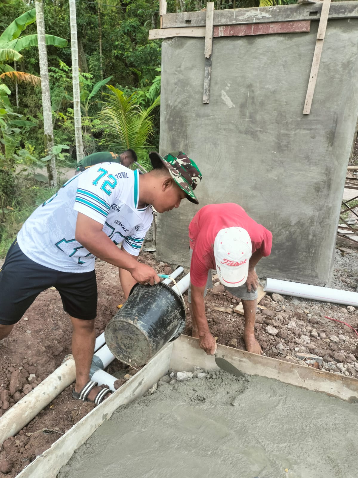 Pada kegiatan tersebut, Pratu Fadil bersama personel Satgas TMMD dan warga setempat melaksanakan pengecoran bak penampung air di bagian belakang bangunan. Pekerjaan itu dilakukan sambil menunggu proses pengeringan pengecoran bagian atas bangunan MCK.