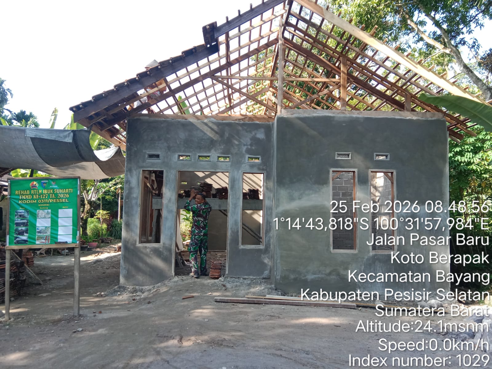 KITASIAR.com – Pembangunan rehab Rumah Tidak Layak Huni (RTLH) milik Suharti, warga Nagari Koto Berapak, Kecamatan Bayang, Kabupaten Pesisir Selatan dalam program TMMD ke-127 Tahun 2026 tampil berbeda dibanding RTLH lainnya. Pada Rabu (25/2/2026), proses pengerjaan memasuki tahap pemasangan atap menggunakan genteng.